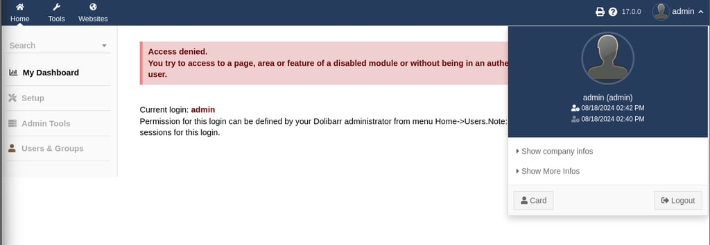 Also it states the CRM version which is Dolibarr 17.0.0.