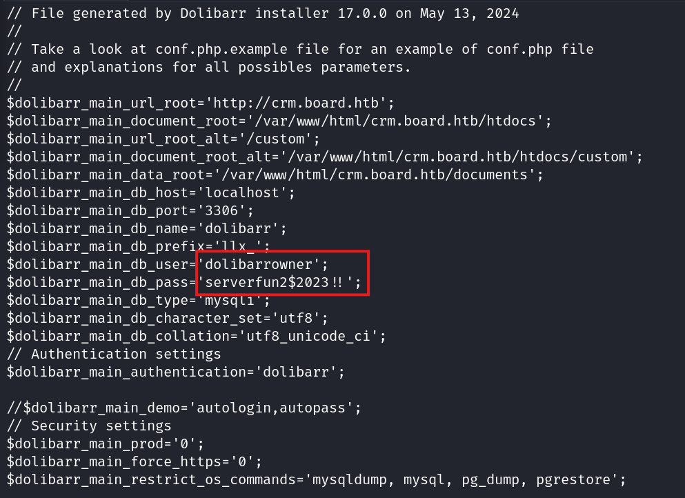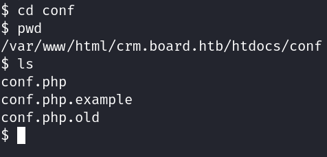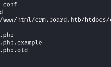 We found some promising files in the directory /var/www/html/crm.board.htb/htdocs/conf.
