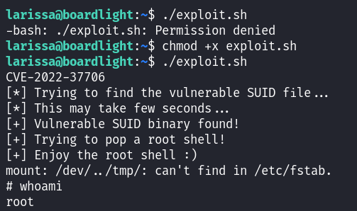 Lets run the exploit.sh in the as the user "larissa" to gain admin privileges.